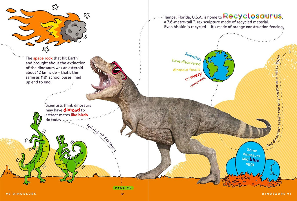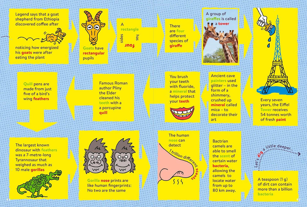 Did you know that a squid has a brain shaped like a doughnut? Or that some butterflies drink turtle tears? Hop from topic to topic in unexpected and delightful ways, and discover what connects a giraffe with the Eiffel tower, or a slice of pizza with Cleopatra. On your awe-inspiring journey, you will find out extraordinary facts about space, bones, dinosaurs, spiders, sharks, robots, ancient Rome and more.