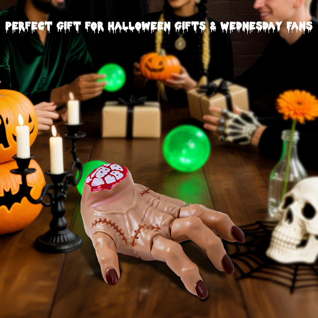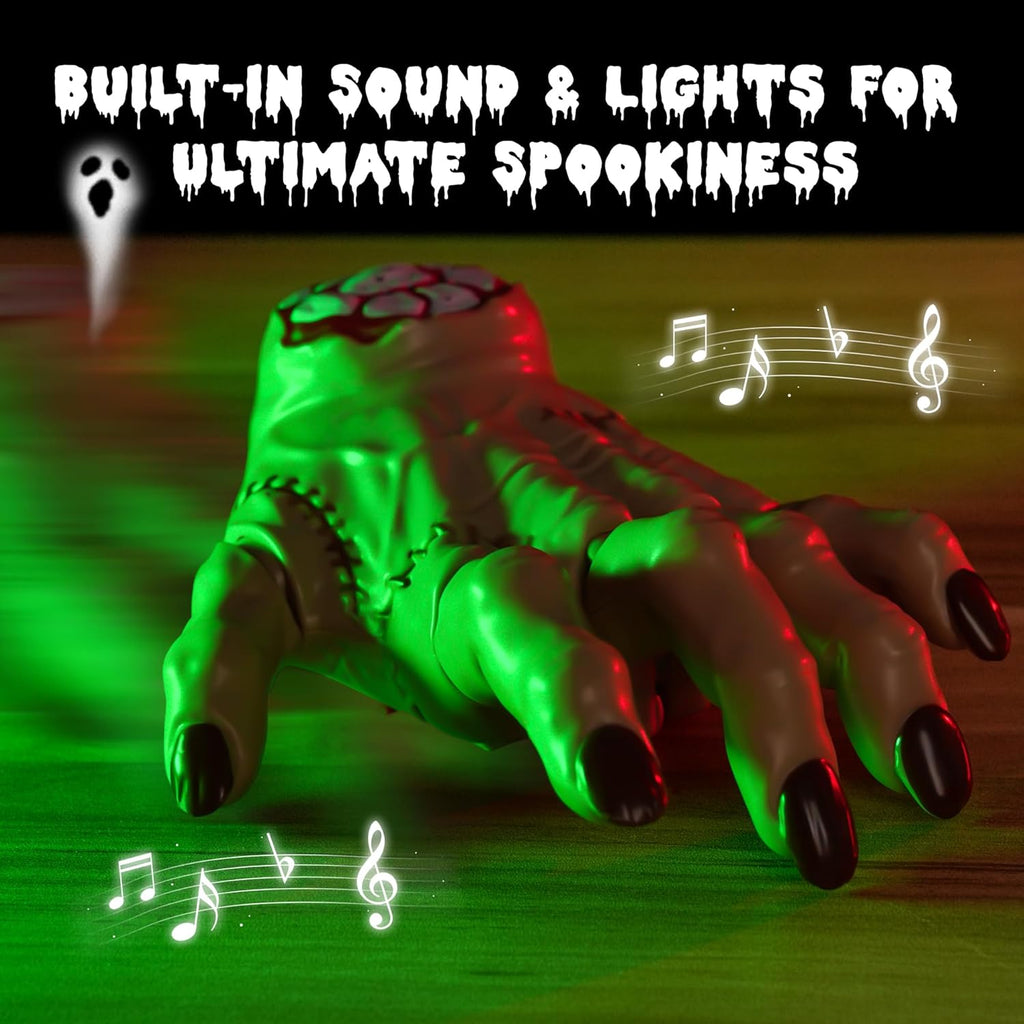Built-in Lights & Sound Effects: Creepy lights and spooky music bring this wednesday animatronic hand to life. Turn off the lights and watch it crawl in the dark like something from a Halloween horror movie.