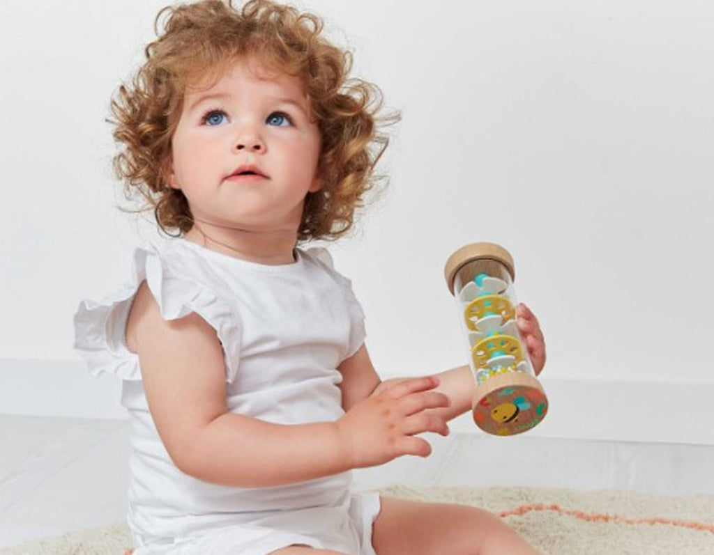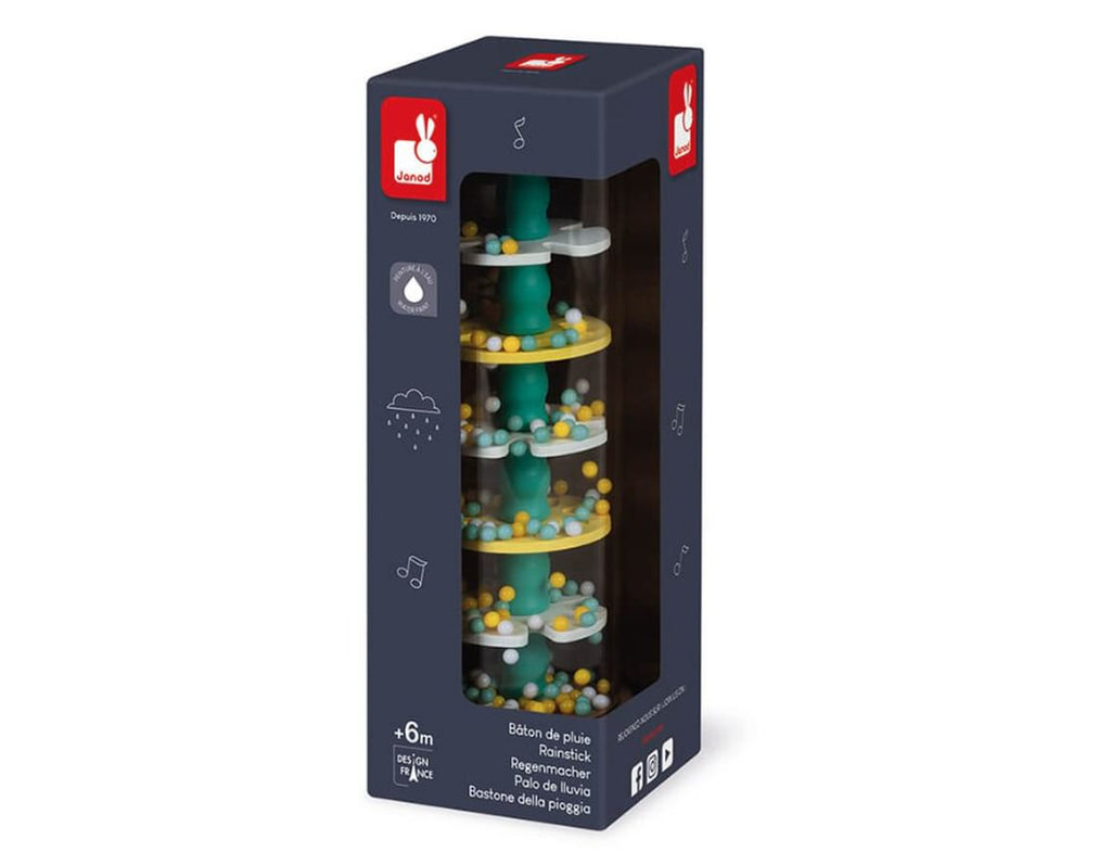 Stimulate the senses and explore rhythm and sound with this fun percussion instrument. Simply shake or flip the 7 inch rainstick and watch in wonder as the beads trickle through the levels, making soothing raindrop sounds. Each wooden end features a cute woodland illustration and the perfectly designed shape makes it easy for little hands to hold. From top French company Janod, this lovely toy is great for independent play. Bee-autiful!