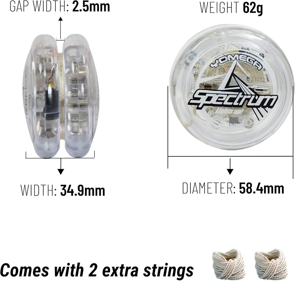 YOMEGA SPECTRUM ANATOMY: Transaxle System for long, smooth spins. Modular design makes it easy to unscrew halves to untangle string or apply lubrication. Durable Polycarbonate. Round Shape. Weight: 62 g. Width/Diameter: 34.9/58.4mm. Gap Width: 2.5mm.